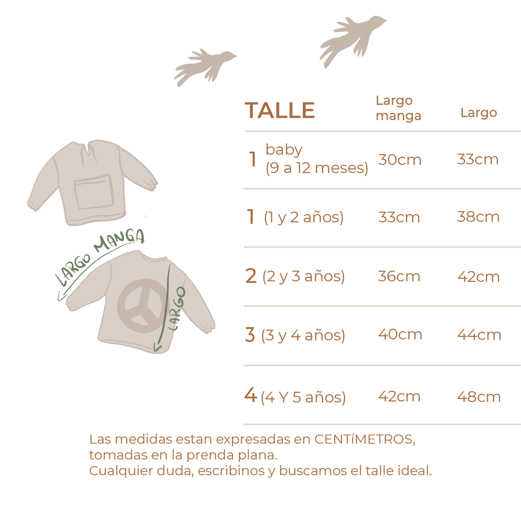 El bucito está confeccionado en tela tussor liviano PREMIUM, lleva lazo regulable en delantero, elástico en las muñecas y el símbolo de la PAZ cosido en la espalda. Tiene un bolsillo que a los niños les encanta para poner todo lo que encuentran! El modelo es super holgado y canchero! Es una prenda atemporal, que la vas a usar en muchos meses del año!
