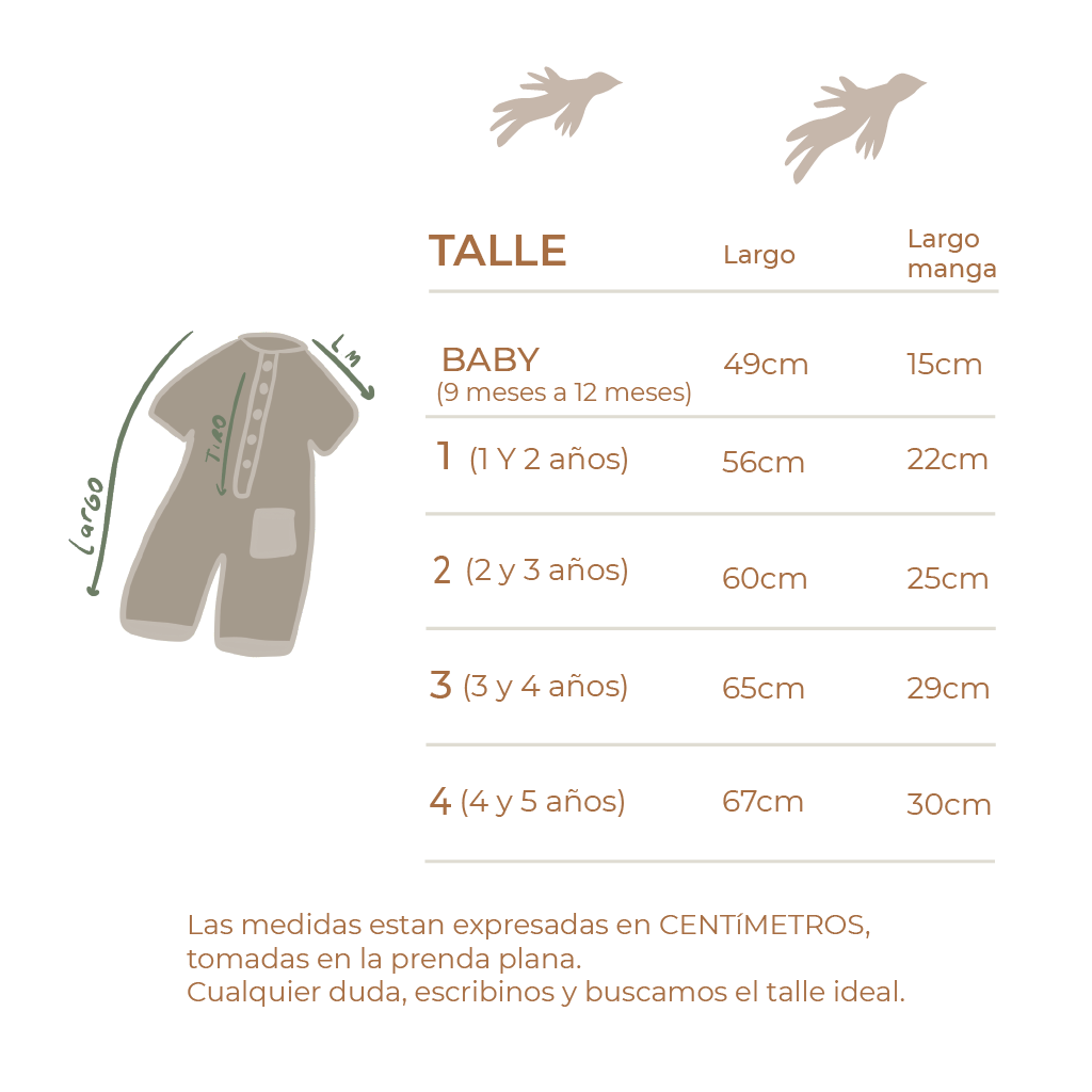 Aconsejamos leer las medidas de las tablas de talles ya que tenemos moldes propios y en general son más largos!